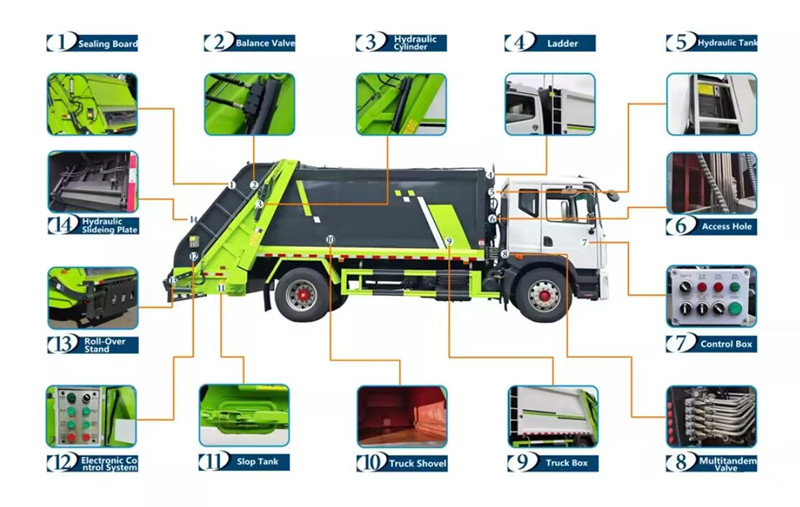 ●10 m³'lük arka yüklemeli çöp sıkıştırma makinesi esas olarak çöp konteyneri, yükleyici, sıkıştırma itme plakası, hidrolik sistem, elektronik kontrol sistemi ve arka kapaktan oluşmaktadır.