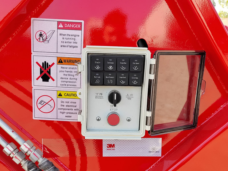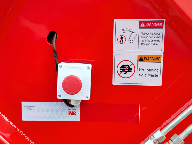 ►Özel olarak tasarlanmış acil durum fren düğmesi, atık sıkıştırma mekanizmasının herhangi bir durumda veya pozisyonda durmasını sağlayarak personel ve ekipman güvenliğini garanti eder.