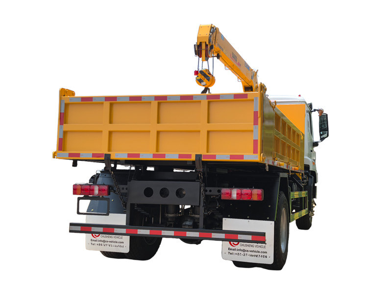 SINOTRUK HOWO damperli kamyon üstü vinç, hem kaldırma hem de boşaltma fonksiyonlarını birleştiren çok yönlü bir mühendislik aracıdır. Yüksek mukavemetli U şeklinde bom ve kargo kutusu kaldırma sistemi ile donatılmış olup, 360° dönebilen kaldırma işlemlerinin yanı sıra malzeme boşaltma işlemini de gerçekleştirebilir. Maksimum 4 ton kaldırma kapasitesi ve maksimum 10 metre kaldırma yüksekliği ile şantiyeler ve depolar gibi çeşitli senaryolar için uygundur. Aşırı yük koruması ve geniş açıklıklı destek ayakları ile tasarlanmış olup, güvenli ve verimli çalışma sağlar.