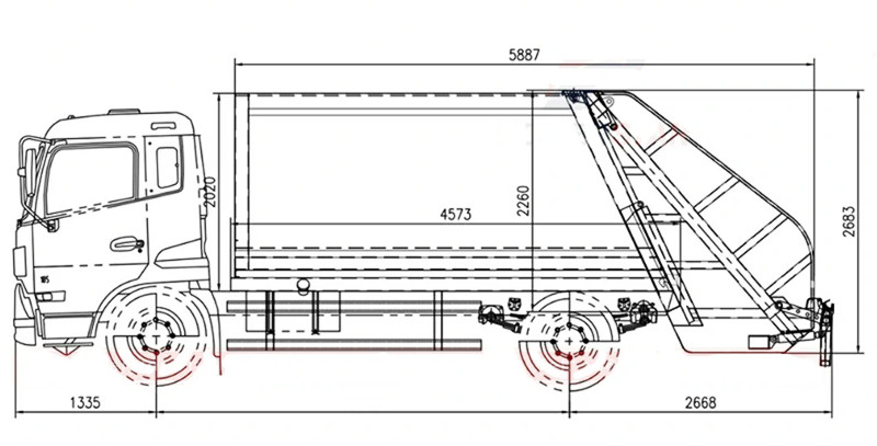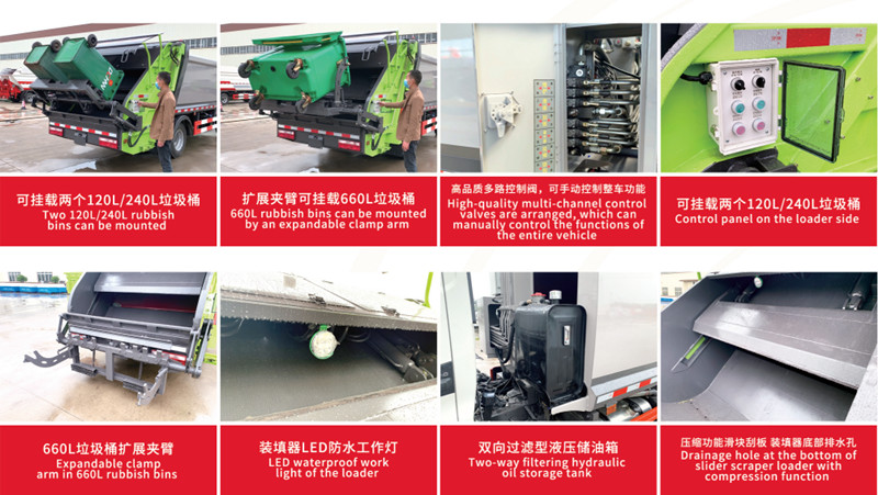 ●Araç, arkasında çöp bidonlarını veya haznelerini otomatik olarak eğerek çöpü sıkıştırma odasına gönderen bir devirme mekanizmasıyla donatılmıştır. Hidrolik iticiler çöpü birden fazla kez sıkıştırarak hacmini orijinal boyutunun yaklaşık üçte birine düşürür ve böylece yükleme kapasitesini önemli ölçüde artırır.